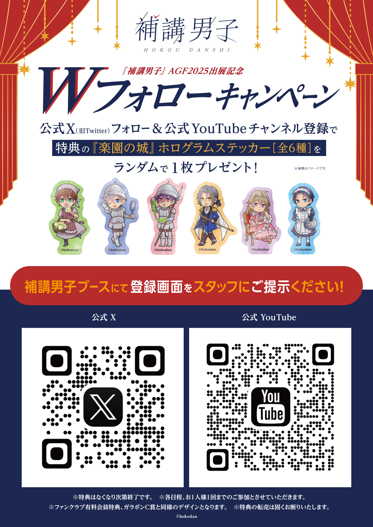 本年は公式X(@hoko_dan)フォローと公式YouTube(@hokodan_channnel)チャンネル登録のWフォローで【特典『楽園の城』ホログラムステッカー(全6種)】をランダムで1枚プレゼントします!